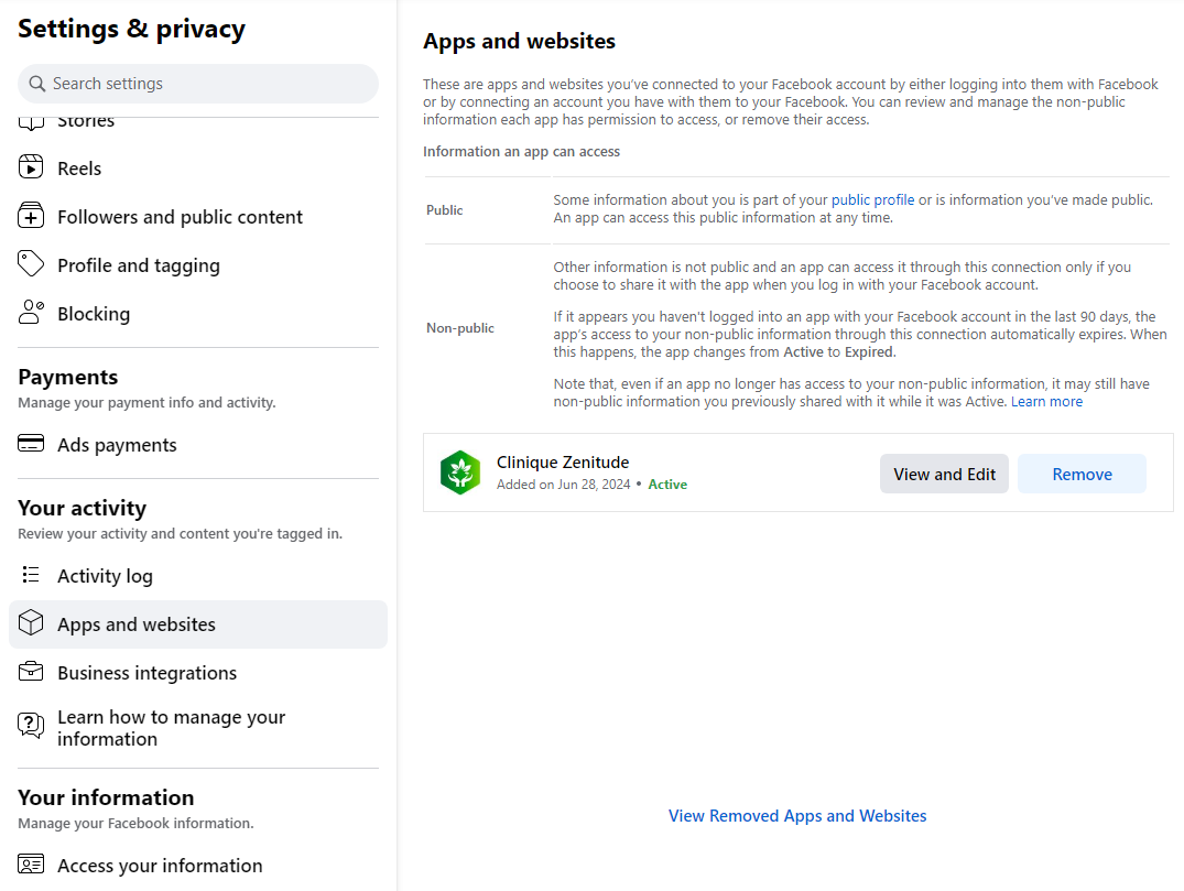 3: In Settings, look for "Apps and websites" and click on that option. There you'll see all the apps and websites linked to your Facebook account.